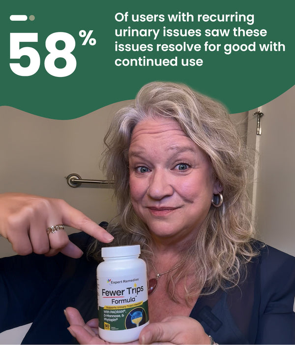 Fewer Trips Formula’s patented formula helps flush out harmful bacteria, soothe bladder irritation, and strengthen urinary health — reducing recurring issues 58%, so you can stay comfortable and pain free.