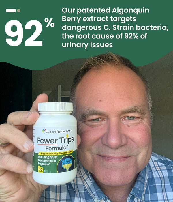 Fewer Trips Formula® is rich in unique antioxidants called polyphenols and tannins, which loosen biological bugs that fasten onto your urinary tract.